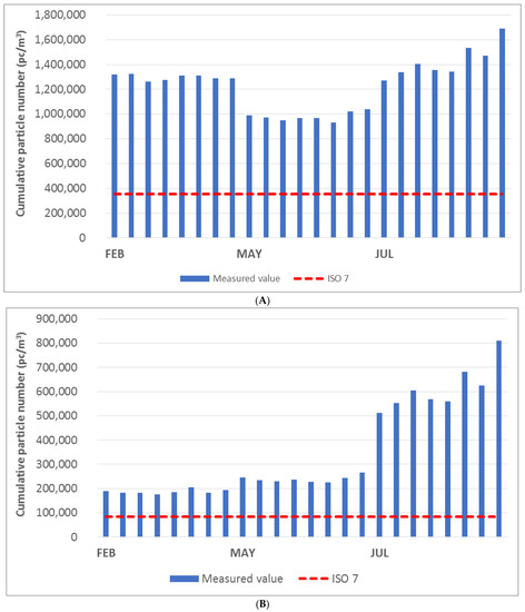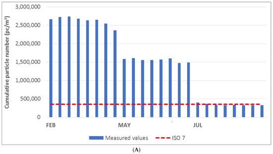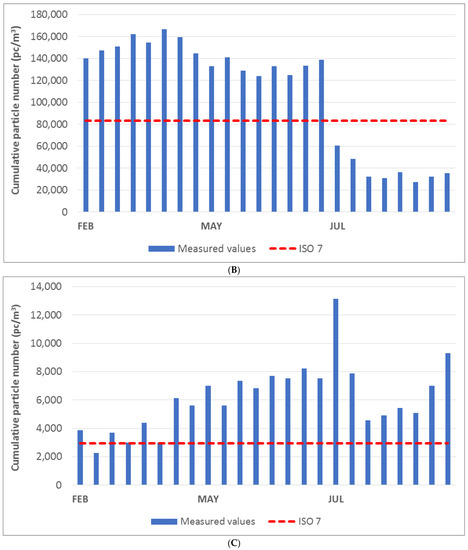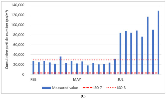 The cumulative particle values for the 0.5, 1.0, and 5.0 μm fractions in the office area are given in Figure 4A–C. It is clear from the diagrams that the limit values given for ISO class 7 were exceeded in all cases (individual measurements, individual fractions). The limit values for ISO class 8 were exceeded for cumulative particle values for >5.0 μm in all months of measurement (see diagram in Figure 4C). Based on the measurement results, the office area could therefore be classified as ISO 9.