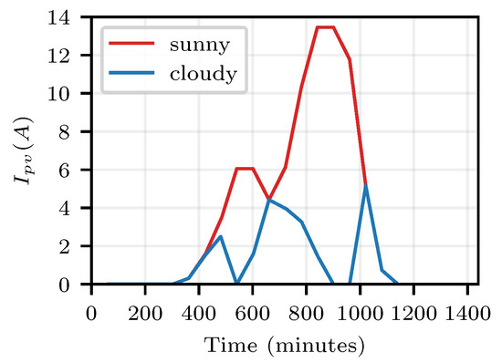 To validate the proposed algorithm, two photovoltaic scenarios were considered as shown in Figure 3. These are directly expressed in terms of the available current . The blue curve, referred to as “sunny”, represents a typical sunny day with few clouds and a high overall energy availability. The red curve, referred to as “cloudy”, represents a day with intermittent rains and a greater number of clouds.
