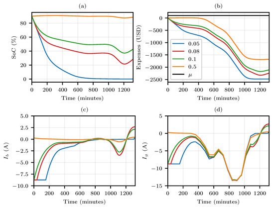 System parameters’ behavior for a sunny day, “” between 0 and 1. In this scenario, , and USD . (a) SoC (%) of the battery; (b) Expense (USD) throughout the day; (c) Battery current; (d) Grid current.