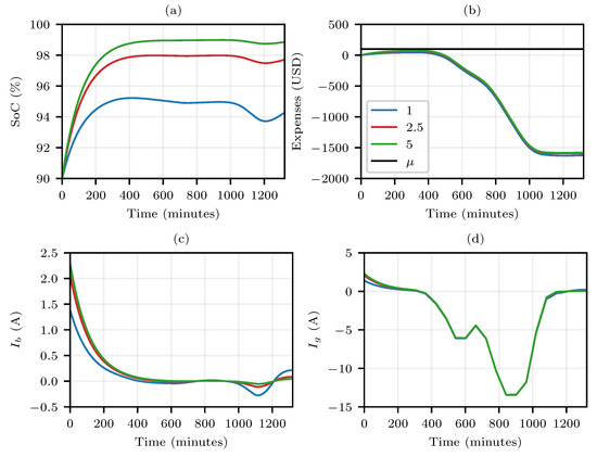 The results show that the lower the value observed for “”, the greater the effort of the system to sell the energy stored in the battery banks. As can be seen in Figure 5c, as “” approached zero, the time during which the discharging current in the battery is maximum increased. In Figure 5a, for each value of “”, it is possible to see the speed at which the battery state of charge decayed, as well as the balance point between purchased and stored energy. As an example, assuming “” equaled 0.1, the algorithm sought to maintain the state of charge at approximately 50% (Figure 5a). As shown in Figure 5d, this balance led to the situation in which all the energy generated at the electric charge station was sent to the grid, which produced profits throughout the day (Figure 5b).