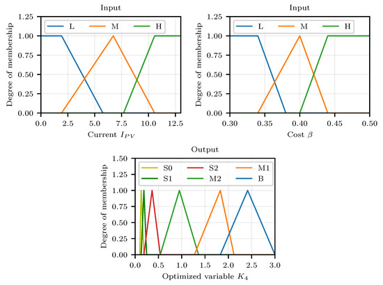 The membership functions of the inputs and output are depicted in Figure 7. For the inputs, the strategy was to utilize the trapezoidal forms for the values that were close to the max ranges, which were selected as the minimum and maximum values of the photovoltaic and cost curves. This way, it worked as a crisp number in that region and started to operate as a fuzzy logic operator as the measures increased or decreased. The abbreviation adopted were L for low, M for medium, and H for high.