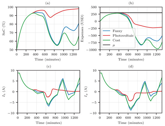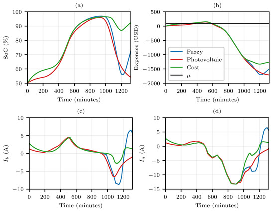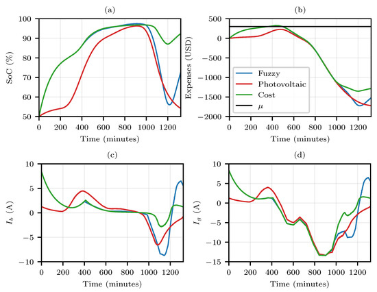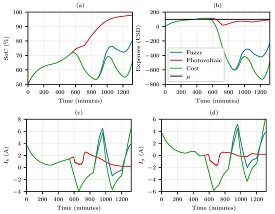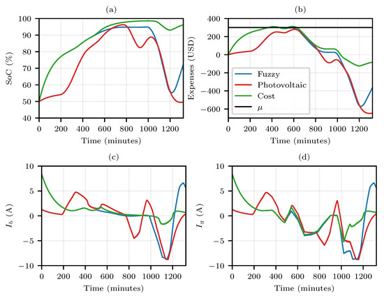 Since there were only small effects caused by the panels in the cases of Figure 15 and Figure 16, it is seen that the system behavior was the same for both the photovoltaic and the cost curves in the first period for both budgets. Moreover, this was not observed in previous scenarios. Furthermore, in Figure 15a,b and Figure 16a,b, the three curves started aligned, but the fuzzy one tended to follow the cost curve behavior as time passed. One also sees that, at the end of the day, the fuzzy controller tended to value higher SoC levels.
