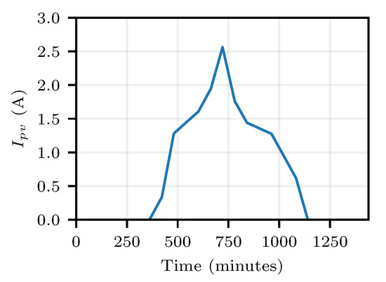 The initial photovoltaic production and cost curves are predictions of behavior. It is important to mention that in a real application, these curves are dynamic, and their profiles are updated throughout the day. Therefore, the effectiveness of the algorithm is based on the actual measurement of each minute of the day, based on the forecast for the next 119 min. That is, for each one-minute step, the input curves are updated, and the optimal current is calculated having and as predicted inputs for the next two hours. In this way, the optimal operating profiles, including , and , are obtained, minute by minute, for a 24 h time interval.