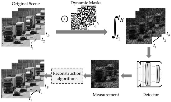 In recent years, a variety of new computational imaging methods based on compressive sensing theory have emerged [6,7]. The Coded Aperture Compressive Temporal Image (CACTI) is one of the representative methods. As shown in Figure 1, this imaging mode first modulates the video scene (image sequence) through different masks and then integrates and accumulates along the time dimension to form a single-frame snapshot measurement, which is finally captured by a two-dimensional detector. Video snapshot compressive imaging modulates and compresses the video sequences in the time dimension, which can reduce the burden of data storage and the requirements of the transmission bandwidth. Since the snapshot measurement is encoded and compressed information, it is necessary to design an efficient reconstruction algorithm to recover the original video, which is an important factor affecting the quality of video snapshot compressive imaging.