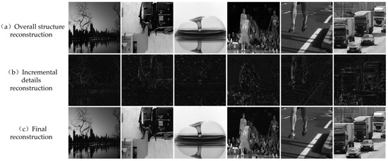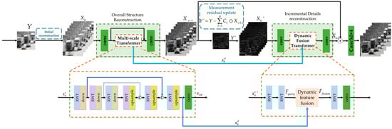 where , is the Hadamard (element-wise) division and is the integral of masks. The initial reconstruction calculated by Equation (5) can contain more scene background information [15] and is then input to the overall structure reconstruction network for subsequent processing.
