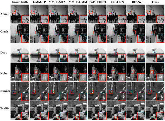 Figure 6 shows the reconstructed video frames of different methods on the simulation datasets. The leftmost column is Ground Truth, and the rightmost is the result of our network. It can be seen from Figure 5 that the video frames reconstructed by GMM-TP, MMLE-MFA and MMLE-GMM have a relatively blurry contour, and there are artifacts in the reconstruction. PnP-FFDNet, E2E-CNN and RE2-Net make some improvements on the contour reconstruction, but they still lack structural details in reconstruction frames. The proposed network can effectively reconstruct the contour structures and detail information of the objects, and it has the best visual quality.