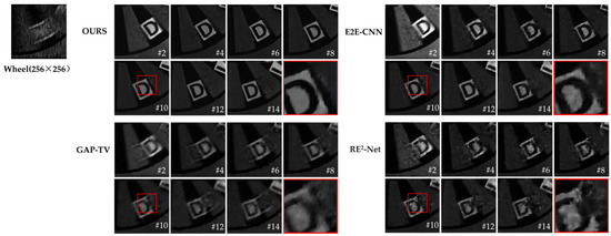 In this section, we apply the proposed network on the real data Wheel captured by the SCI camera [7]. The size of the measurement is 256 × 256, which is obtained by encoding every 14 frames by shifting binary random masks. Due to the lack of corresponding original video, we cannot calculate the evaluation metrics and instead evaluate the visual quality of the reconstructed videos. Figure 7 shows the reconstruction results of the proposed network, E2E-CNN, GAP-TV and RE2-Net for the Wheel dataset. It can be observed that the results of the proposed network can obtain sharper edges of the letter “D” and a clearer scene. There are some artifacts in the reconstructions of GAP-TV and RE2-Net. The reconstruction results of E2E-CNN have less accurate motion information and contour details.