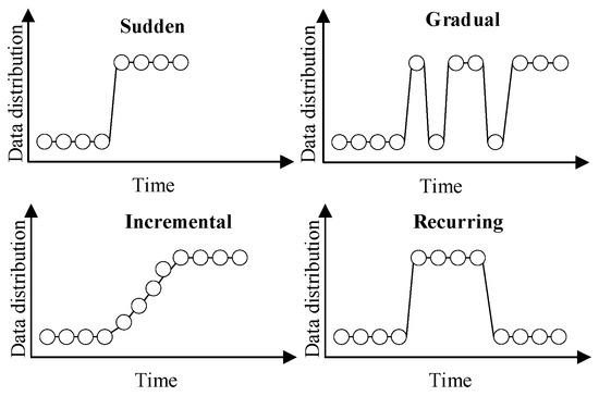 Concept drift is one of the challenges frequently faced in data stream learning tasks. In concept drift data streams, the data distribution changes over time. Zhang et al. [7] described the generation of concept drift, which occurs when the joint probability distribution at two time points t and t + 1 changes, which is noted as . Currently, according to the speed of drift change, it can be classified as sudden drift, gradual drift, incremental drift, and recurrent drift, as shown in Figure 1.