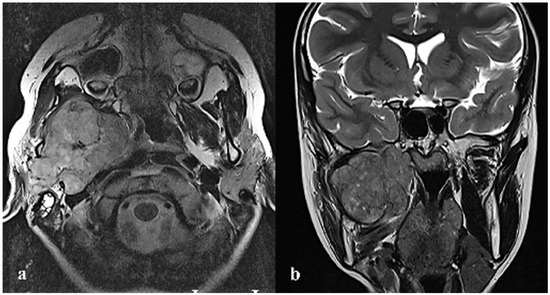 A 12-year-old male was referred to the Unit of Orthodontics and Dental Sleep Medicine in the Department of Biomedical and Neuromotor Sciences of the University of Bologna to be evaluated by an orofacial pain specialist. The patient reported intermittent very intense stabs of pain occurring every 5 min, with a continuous dull pain around the ear, in the temple and in the jaw on the right side. A limitation in mouth opening was also reported. The patient associated the onset of the symptoms to a hit on the face received during water polo training 4 months earlier. The pain worsened over time and did not respond to drug therapies. The clinical examination was performed following the Diagnostic Criteria for Temporomandibular Disorders (DC/TMD) [13]. The non-assisted mouth opening presented a severe limitation (24 mm) and a mandibular deviation on the right side. The assisted and passive mouth opening were 35 and 40 mm, respectively, and exacerbated the pain in the right temporomandibular area and in the temple. The palpation of the right masseter and temporalis muscles caused severe pain to the patient, while no muscle pain was registered on the left side. Paresthesia in the right temporomandibular joint (TMJ) area and hyperalgesia in the right side of the mandible were also registered. No acute dental conditions, periodontal inflammations, nor intra- and extra-oral swelling were detected. The patient had been previously evaluated by other colleagues: a pediatrician prescribed analgesics and non-steroidal anti-inflammatory drugs (paracetamol and ibuprofen) for pain control, obtaining scarce success. An ENT specialist prescribed steroidal anti-inflammatory drugs that were also not effective in pain reduction and requested for a computerized tomography (CT) that did not show significant problems affecting the facial bones and the TMJ. Further investigating the history, a discomfort related to the jaw movement previous to the facial trauma was also reported by the patient: it started about one year earlier as an impairment and worsened over time. The clinical aspects and the evaluation of the anamnesis suggested a request for a Nuclear Magnetic Resonance (NMR) of the skull and of the TMJs. The NMR revealed a solid expansive lesion without hypervascularization in the right pterygoid area with a diameter of 61 × 40 mm in the axial plane and a craniocaudal extent of 59 mm. The upper portion of the lesion eroded the skull base invading the intracranial area. The lateral portion reached the mandibular ramus extending from the angle to the condyle, that appeared reduced to in size due to the erosion of its medial portion by the tumor. The retro-lateral lymph nodes appeared enlarged (Figure 1).