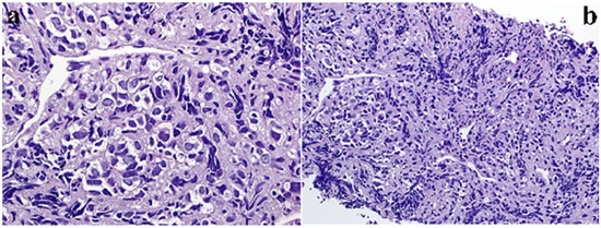 Hematoxylin–eosin stain of the tumor mass in the temporomandibular area: (a) high magnification microscope view (400×). Cell proliferation organized in nests and chains. Presence of eosinophils and clear cytoplasm; (b) medium magnification microscope view (100×). Epithelial-like and spindle cells with pleomorphic and hyperchromatic malignant nuclei.