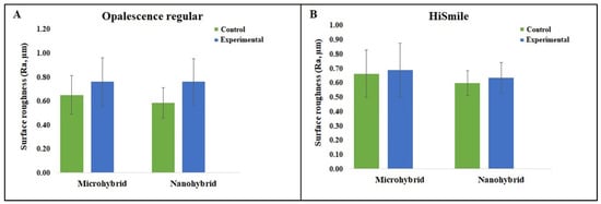 Graphical representation of surface roughness of the control and experimental groups: (A) surface roughness using Opalescence Regular bleaching gel on microhybrid and nanohybrid restorative composites. (B) depicts the surface roughness using HiSmile™ bleaching gel on microhybrid and nanohybrid restorative composites.