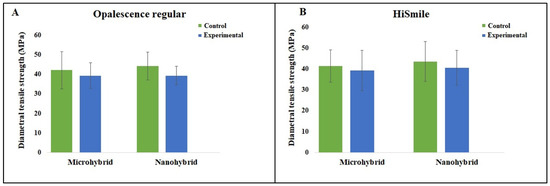 Graphical representation of diametral tensile strength of the control and experimental groups: (A) Diametral tensile strength using Opalescence Regular bleaching gel on microhybrid and nanohybrid restorative composites; (B) depicts the diametral tensile strength using HiSmile™ bleaching gel on microhybrid and nanohybrid restorative composites.
