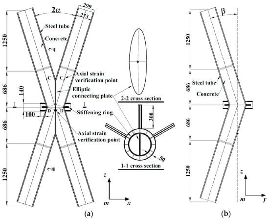 The CFST-space intersecting node structure in oblique mesh proposed by Huang [21] was adopted. The structure was formed by four CFST columns intersecting at a certain angle in space. The four steel-tubed concrete columns of the node were cut along the space intersecting line and welded to an elliptical connecting plate. Concrete was poured inside the steel tubes. The main connecting and restraining components were the elliptical connecting plate, circumferential reinforcing ring, and circumferentially arranged stiffening ribs for out-of-plane restraint. All steel components were welded, as shown in Figure 1, where O in Figure 1a is the point for extracting the node’s out-of-plane and vertical displacement.