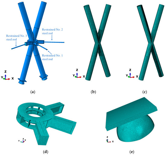 Finite Element Model. (a) Overall model. (b) Mesh division of external steel pipes. (c) Mesh division of core concrete. (d) Circumferential constraints. (e) Backing plate and spherical hinge.