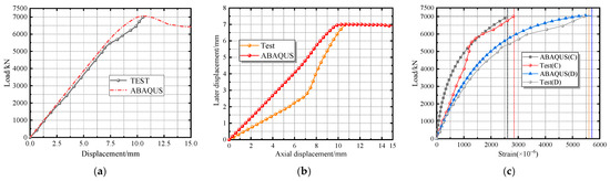 Comparison between Test Curve and Finite Element Curve. (a) Axial displacement-load curve. (b) Axial displacement-lateral displacement curve. (c) Load-axial strain curve.