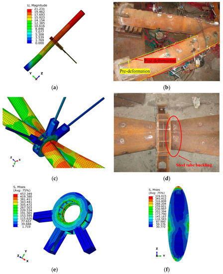 Comparison of Failure Modes between Finite Element Model and Test Component. (a) Failure pattern of finite element model. (b) Bending failure of lower extremity steel pipe of test member. (c) Steel pipe bulging in joint area of finite element model. (d) Steel pipe bulging in the joint area of test member. (e) Mises stress of restrained steel parts. (f) Mises stress of elliptic connecting plate.