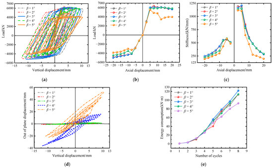 Relevant mechanical property parameter curves of components with different space angles. (a) Displacement load curve. (b) Skeleton curve. (c) Stiffness degradation curve. (d) Axial displacement-out of plane displacement curve. (e) Energy consumption curve.