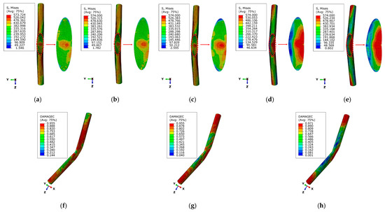 Mises stress and concrete compression damage of members with different space angles. (a) β = 1°. (b) β = 2°. (c) β = 3°. (d) β = 4°. (e) β = 5°. (f) β = 1°. (g) β = 4°. (h) β = 5°.