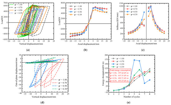 Relevant mechanical property parameter curves of members with different symmetry coefficients. (a) Displacement load curve. (b) Skeleton curve. (c) Stiffness degradation curve. (d) Axial displacement-out of plane displacement curve. (e) Energy consumption curve.