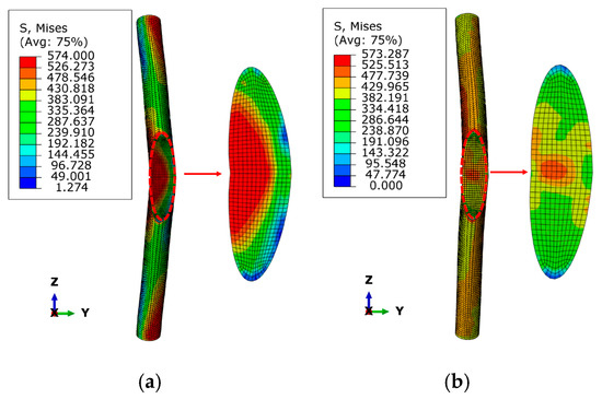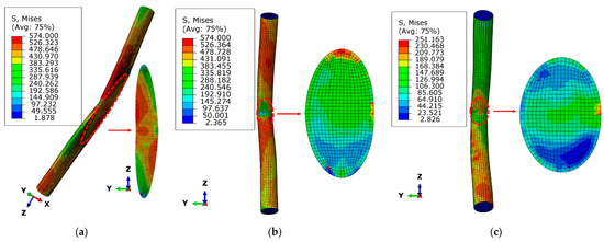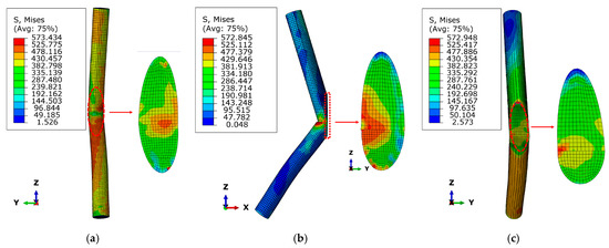 Mises stresses of members with different plane symmetry coefficients. (a) Symmetry coefficient = 0.70. (b) Symmetry coefficient = 0.50. (c) Symmetry coefficient = 0.39.