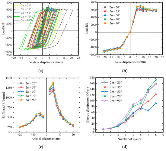 Figure 9 presents the mechanical performance parameters of components with different plane angles. As shown in Figure 9a,b, the specimens’ ultimate load and overall compressive stiffness were positively correlated with the plane angle. The effect of the plane angle on the positive ultimate load was more significant than that on the negative ultimate load. The negative initial stiffness of all specimens had a significant difference. However, the difference in the stiffness degradation curve was slight in the later loading stage, indicating that the change in the plane angle had little effect on the tensile performance of the node. The positive residual loads of the specimens with plane angles of 70° and 90° were 0.854 and 0.868 of their ultimate loads, respectively. The degradation rate of positive stiffness was higher, and the load-bearing capacity was lower than other components. Notably, the hysteresis curves of these two types of components exhibited obvious left and right shifts, indicating that the plastic deformation and vertical residual displacement of the node were large. According to Figure 9d, except for the component with a plane angle of 35°, the energy consumption of the other components increased nonlinearly. Especially, the component with a plane angle of 50° showed a decrease in energy consumption capacity in the seventh cycle, and the total energy consumption was only 0.5269 of that of the component with a plane angle of 70°.