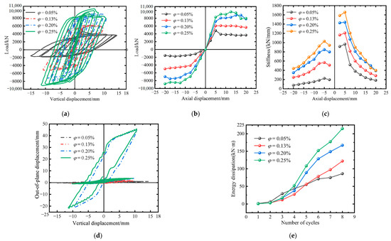 The curve diagrams of mechanical performance parameters for components with different steel contents are shown in Figure 11. As shown in Figure 11a, the steel content significantly influenced the hysteresis curve shape of the component. The hysteresis curve of the specimen with a steel content of 0.05 was shuttle-shaped, with a smaller area enclosed by the hysteresis loop, indicating a weaker energy dissipation capacity. Combined with Figure 11e, it can be seen that although the energy dissipation of the specimen with a steel content of 0.05 increased step by step, the increasing rate was relatively small compared to other components. This was mainly due to the smaller hoop coefficient, which cannot provide sufficient hoop restraint for the circumferential expansion of the steel tube on the core concrete, resulting in local bulging. The total energy dissipation of the specimens with steel contents of 0.20 and 0.25 was increased by 94.17% and 149.43%, respectively, compared to the specimen with a steel content of 0.05. This was partly due to the significant improvement of the tensile and compressive properties of the component with the increase in steel content and partly due to the nonlinear increase in the out-of-plane displacement of the specimens with steel contents of 0.20 and 0.25 in the last cycle, increasing in the vertical displacement of the nodes.
