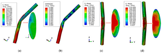 Figure 4 shows a comparison between the Mises stress cloud map of the finite element model and the experimental situation. As shown in Figure 4a–d, both the experimental and finite element components experience two types of failure: buckling failure of the steel tube in the node area and bending failure of the steel tube in the non-node area. According to Figure 4c, when the wall thickness and concrete strength of the steel tube in the node area and non-node area are inconsistent, the Mises stress shows non-uniformity along the boundary line, indicating that changes in wall thickness are not conducive to the uniform transmission of stress. This may be one of the essential reasons for the large bending deformation of the steel tube in the non-node area. The buckling phenomenon of the steel tube in the node area is more obvious, while the steel tube reinforced by the circumferential reinforcement does not show obvious deformation. As shown in Figure 4e,f, the Mises stress of the circumferential reinforcement, stiffeners, and elliptical connection plate is far less than the tensile strength of the steel, and the stress distribution is uniform and symmetrical, indicating that they can still provide good constraints and reflect the restrictive effect of circumferential constraints on the component in the experiment. In summary, the finite element model can well reflect the interaction between the components in the experiment, and this modelling method can be used for further analysis and research on intersecting nodes.