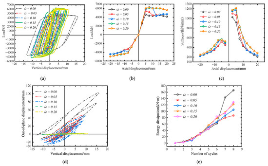 According to Figure 13d, the node with ώ of 0, i.e., without lateral constraint, exhibited nonlinear growth of vertical and out-of-plane displacement in the later stage of the cycle, with peak values of −16.15 mm and 102.90 mm, respectively. This was also the main reason for its sudden increase in energy dissipation capacity (Figure 13e). The specimens with ώ of 0.05 and 0.10 exhibited a significant descending segment in the positive direction of the hysteresis curve, and the latter exhibited a sudden drop-unloading phenomenon of the skeleton curve after the axial displacement was 10 mm, mainly due to the fracture of the lateral constraint bar in the 0° direction. The skeleton curve then stabilized and had an upward trend, mainly due to the lateral constraint in the ±45° direction beginning to constrain the out-of-plane deformation. Except for the unconstrained nodes that experienced large out-of-plane deformation failure, the energy dissipation capacity of the other specimens increased with the increase in ώ, indicating that the out-of-plane constraint is a key factor affecting the seismic performance of the node.