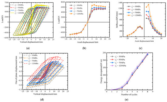 According to Figure 15e, the energy consumption capacity of each specimen stage increased with the increase in concrete strength. The total energy consumption of the component with a concrete strength of 120 MPa was 31.70% higher than that of the component with a concrete strength of 30 MPa, but the improvement was not very large. After analysis, it was found that this was mainly because when the concrete strength is higher, the core concrete needs a larger constraint, i.e., the hoop coefficient is larger. For stiffness degradation, the rate of stiffness decay in the later stage of the component with higher concrete strength increases due to its high brittleness, and the residual stiffness is not much different. For the out-of-plane displacement evolution, all specimens’ vertical displacement-out-of-plane displacement curves have the same shape and evolution law without apparent fluctuation, indicating that the out-of-plane constraint condition is sufficient. Except for the curve of the component with a concrete strength of 120 MPa, all other curves evolve cyclically around the coordinate (0, 0). After analyzing the results of the finite element model, it was found that this was mainly because the non-node area steel tube concrete column of the component with a strength of 120 MPa undergoes slight bending in the early loading stage, resulting in out-of-plane residual deformation at the node. However, the maximum out-of-plane displacement of all specimens was not greater than 2.5 mm, which is still within the controllable range. The strength enhancement coefficient in Table 3 was inversely proportional to the concrete strength, indicating that the constraint effect of the external steel tube on the core concrete gradually decreased with the increase in concrete strength.