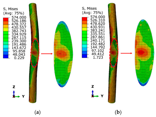 Mises stress nephogram of members with different concrete strength. (a) fc = 30 MPa. (b) fc = 120 MPa.