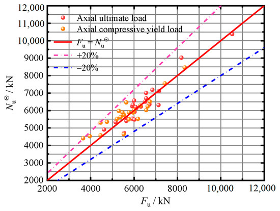 Comparing the theoretical calculation values with the ultimate bearing capacity and yield load of the finite element model, as shown in Figure 19. The mean ratio of the two was 0.999 and 1.0323, respectively, and the error was within 20%. Obviously, the two had good consistency and could be used to estimate the node’s yield load and ultimate load.