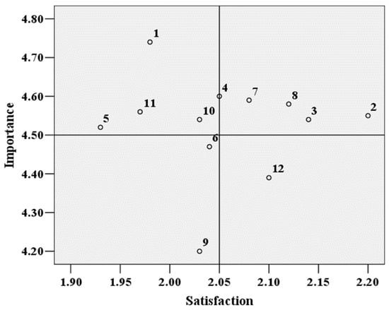 An IPA has been widely used in many other industries. Disastra et al. [] applied an IPA in the tourist industry to investigate the tourists’ satisfaction levels with tourism destination attributes in Ciamis Regency, Indonesia. By using IPA, they knew which attributes needed to be a priority to improve and which attributes should be maintained to ensure tourist satisfaction. Moreover, Simpson and Parker [] utilized an IPA to evaluate the importance and satisfaction levels of public green infrastructure and urban nature spaces in Perth, Western Australia. By applying the IPA technique, the researchers were able to collect valuable data that could be used to inform evidence-based approaches for managing and allocating resources to PGI and UN spaces. Das and Basu [] utilized an IPA to evaluate the satisfaction of local communities with ecosystem services in Chatra Wetland, India. An IPA has also been used by colleges for measuring student satisfaction levels to increase competitive advantages. Zulfahri et al. [] implemented an IPA to evaluate services provided to students so the college could improve the quality of service based on students’ perspectives to increase student satisfaction in the future.