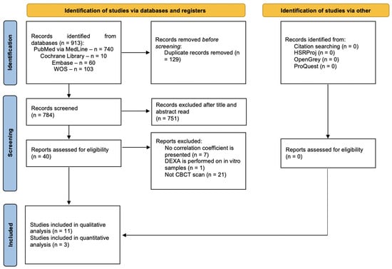 The following inclusion criteria were used: (1) Participants: adults (aged 18 years and over), male or female, with or without a diagnosis of osteoporosis, and with or without bone fractures; (2) papers where a correlation coefficient was calculated to assess the relationship between BMD measured with CBCT and the lumbar spine or femoral neck BMD measured by DEXA; (3) Study design: randomized controlled trials (RCTs), controlled clinical trials (CCTs) and cohort studies that show the correlation coefficient between DEXA and CBCT; 4) studies in humans. The following exclusion criteria were considered: (1) Participants: children or animal studies; (2) papers where a correlation coefficient between DEXA and CBCT technologies was not calculated; (3) Study design: case reports, case series, editorials, conference abstracts, opinion letters, book chapters; (4) studies with missing data.