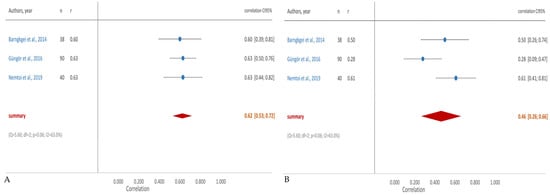 Forest plot of quantitative analysis between the CBCT/CT and DEXA: (A) minimum correlation value; (B) maximum correlation value [,,].