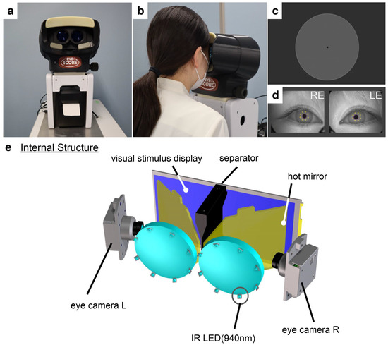 We developed a new measurement device (“EyeScore”, Figure 1) by modifying the commercially available eye-tracking device ORTe EYENAC (NAC Image Technology Inc., Tokyo, Japan). The EyeScore presents stimuli on an internal liquid crystal display (LCD) monitor and simultaneously measures the gaze of both eyes. With separator, EyeScore presents images to the left and right eyes independently (Figure 1e). The size of the internal monitor was 6 inches, with a resolution of 2560 × 1440 pixels. The image on the LCD monitor was designed to be viewed through the eyepiece at 33 cm. EyeScore has a built-in computer that generates visual stimuli, detects eye position, and records data (Figure 2). In addition, there are two cameras that record the right and the left eye at the same time, and both eye positions are detected independently. The sampling rate for eye position measurement was 30 Hz. There was a delay of 3–5 frames (mean 4.5) between the stimulation subsystem and eye-position-measuring subsystem. Accordingly, eye position data were delayed by approximately 0.15 s to the visual target presentation.