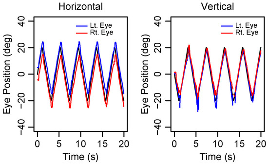 Eye positions for horizontal and vertical eye movements. Examples of (left) horizontal and (right) vertical eye movements elicited by horizontal and vertical target motions, respectively. The target was moved at a rate of 20 deg/s. The black line indicates the trajectory of the visual target, and the red and blue lines represent the right and left eye positions, respectively. Positive values indicate a rightward gaze for horizontal eye movements and upward gaze for vertical eye movements. The target position was indicated by an angle centered on the root of the nose, and the gaze of each eye was indicated by an angle centered on the pupil center. Therefore, slight deviations were observed between the left and right eyes during horizontal eye movements.