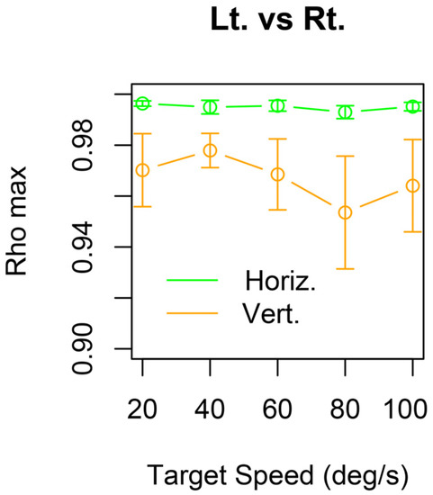 Rho max between both eye positions at each target speed. The cross-correlation coefficient reached a maximum (rho max) when the time lag was zero for both (green) horizontal and (orange) vertical eye movements. The average rho max values across all velocities were 0.995 ± 0.008 and 0.967 ± 0.062 in the horizontal and vertical directions, respectively (mean ± standard deviation).