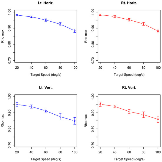 Rho max decreased for faster visual target motions. The upper and lower figures show the horizontal and vertical gazes, respectively. The left and right figures show the results for the left and right eyes, respectively. Error bars represent standard errors.