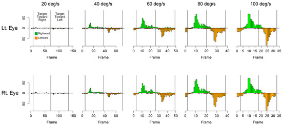 Frequency of saccades at each visual target speed. The number of saccades within a frame during horizontal eye movements at each target speed. The data are summed across all the participants. The first and second halves of the histograms depict the results when the target moved to the right (green) and left (orange), respectively. The horizontal axis represents the frames of the cycle. Note: The center of the ordinate represents zero (no saccades). The upper and lower scales are for rightward motion (green) and leftward motion (orange), respectively.