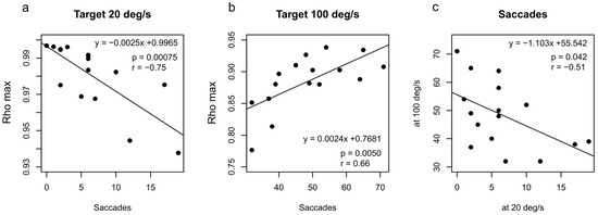 The correlation between the frequency of saccades and rho max at each target speed was analyzed. The correlation coefficients for visual target speeds of 20, 40, 60, 80, and 100 deg/s were −0.75 (p < 0.001), −0.42 (p = 0.102), −0.24 (p = 0.367), 0.09 (p = 0.745), and 0.66 (p = 0.005), respectively. At the lowest visual target speed (20 deg/s, Figure 8a), rho max was negatively correlated with the frequency of saccades. Conversely, positive correlations were observed at the highest visual target speeds (100 deg/s, Figure 8b). A negative correlation was observed between the frequency of saccades at the lowest and highest visual target speeds (Figure 8c).