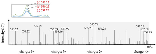 Next, we found the isotopic peak cluster of position I; at this point, we could determine the precursor charge state. Figure 3 shows the correspondence between different isotopic peak clusters and charge states. In addition, chromatograms a, b, and c are the chromatograms of precursor ions with m/z of 552.22, 550.22, and 551.22, respectively. We can see that the chromatograms of these ions are highly consistent; the only difference is in their intensity. When we calculate the similarity of chromatograms, it is possible to repeat the selection. Therefore, this is likely to result in complete consistency in the sequence of identification results. During the experiment, if we do not process these results, there will be much redundancy, which will miss the real ion signal peak that should be extracted and reduce the efficiency of mass spectral analysis. Therefore, when we extract the precursor ion chromatograms, we should remove the isotopic peak cluster and only retain the precursor ion with higher intensity.