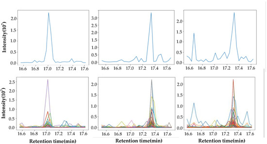 Next, we extracted ion chromatograms (XICs) for all fragment and candidate precursor ions in the isolation window. According to the consistency between the precursor and its fragment ion chromatograms, the entire MS/MS spectrum was interpreted, and the correspondence between precursor and fragment ions was found. The charge state of the precursor was also determined. In this way, we could obtain the pseudo-MS/MS spectra. In Figure 5, we show the chromatograms of the precursors and their fragment ions with high similarity. The three curves in the upper part of Figure 5 are precursor ion XICs, and the curves in the lower part of Figure 5 are their corresponding fragment ion XICs.
