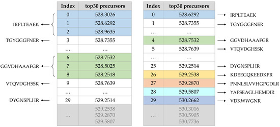 Then, we tested the effect of removing the isotopic peak cluster in the process of interpreting the spectrum. In the Materials and Methods section, we mentioned that for each MS/MS, we chose the top 30 precursor ions. Because the chromatograms of the precursor and its isotopic peaks are consistent, we took the top 30 precursor ions and their identification results before and after removing the isotopic peak cluster; an example is shown in Figure 6. The table on the left represents the top 30 precursor ions selected before removing the isotopic peak cluster and their identification result sequences. The identification results of the blue and green isotope peak clusters are completely consistent, and there is redundancy, which is not conducive to improving the result performance. The right side shows the top 30 precursor ions that were selected after removing the isotopic peak cluster and their identification result sequences, and the number of identification results significantly increased.