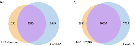 First, we compared the number of different identified peptide ions of CorrDIA and DIA-Umpire. In Figure 7a (the numbers in the figure are the numbers of identified peptides), about 63% of the peptides identified by CorrDIA were also identified by DIA-Umpire, and about 71% of the peptides identified by DIA-Umpire were also identified by CorrDIA, a 12% increase compared to DIA-Umpire. As shown in Figure 7b, approximately 73% of the peptides identified by CorrDIA were also identified by DIA-Umpire, and approximately 88% of the peptides identified by DIA-Umpire were also identified by CorrDIA, a 21% increase compared to DIA-Umpire.