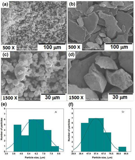 Figure 3 displays the secondary electron micrographs corresponding to (a) Al at 500×, (b) Cr at 500×, (c) Al at 1500×, (d) Cr at 1500×. From the mentioned micrographs it can be observed that Al possesses a spherical morphology with a mean particle size of 3.99 microns. Cr particles have a flake shape and are 37.9 microns in size on average. Figure 3e,f also show the distributions of the particle sizes of Al and Cr, respectively. Both histograms denote that most Al particles have a particle size between 5.4 and 7 µm, while Cr particles have particle sizes between 47.9 and 67 microns.