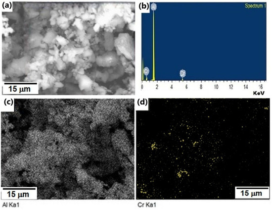(a) microstructure of Al-Cr milled for 20 h, (b) chemical analyses of the surface presented in (a,c), and (d) X-ray chemical mappings of Al and Cr, respectively.