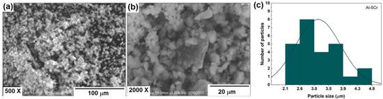 Figure 5 shows SEM micrographs of the previously ball-milled powder with composition of Al-5Cr for 20 h. Micrographs obtained at 500× and 2000× denote that the particles exhibit an irregular morphology with round borders with a mean size of particle of 3.14 μm. Figure 5c exhibits the particle size distribution histogram of Al-5Cr powder mixture ball milled under the specified conditions, where it is observed that most Al-5Cr particles have particle sizes between 2.6 and 3 microns.