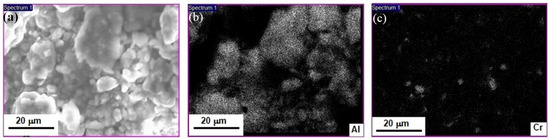 Figure 7b,c presents the X-ray chemical maps referring to the Al-7.5Cr exemplar after being processed for 20 h. These chemical maps suggest that both elements (Al and Cr) are uniformly distributed in the studied surface displayed in Figure 7a; however, the X-ray signals radiated by Cr are weak, where this performance is due to the low content of this element acting partially as solute. In addition, it is worth noting that X-ray signals emitted by Cr element occupy more area fraction in the micrograph (Figure 7c) than the same radiation emitted by the Al-5Cr specimen, see Figure 4d.