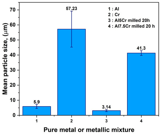 Mean particles sizes and error bars for pure Al and Cr, as well as powder mixtures Al5Cr and Al7.5Cr.