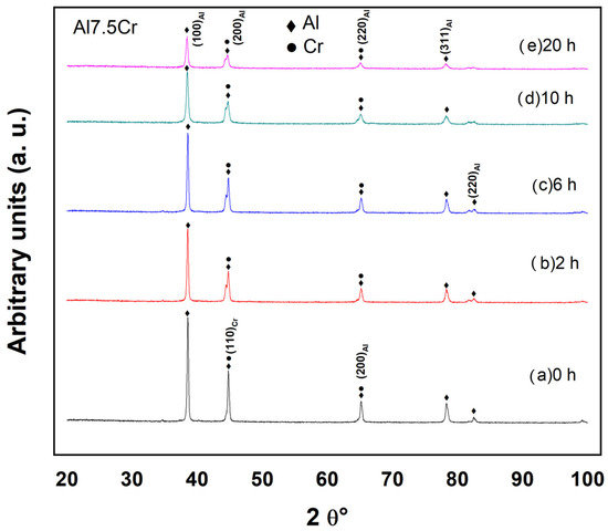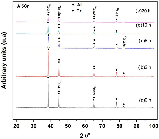 Figure 9 depicts the X-ray diffraction spectra of the ball-milled powder mixture Al-5Cr during various periods of time. The diffraction peaks associated with the Al phase were created via diffraction on the (111), (200), (220), (311), and (222) crystallographic planes, as shown in this X-ray spectrum. In the same way, the X-ray diffraction spectra shows that the diffraction peaks generated by the diffraction on the (200) and (220) crystal planes of Al overlap with the diffraction peaks produced by the (100) and (200) crystallographic planes of Cr.